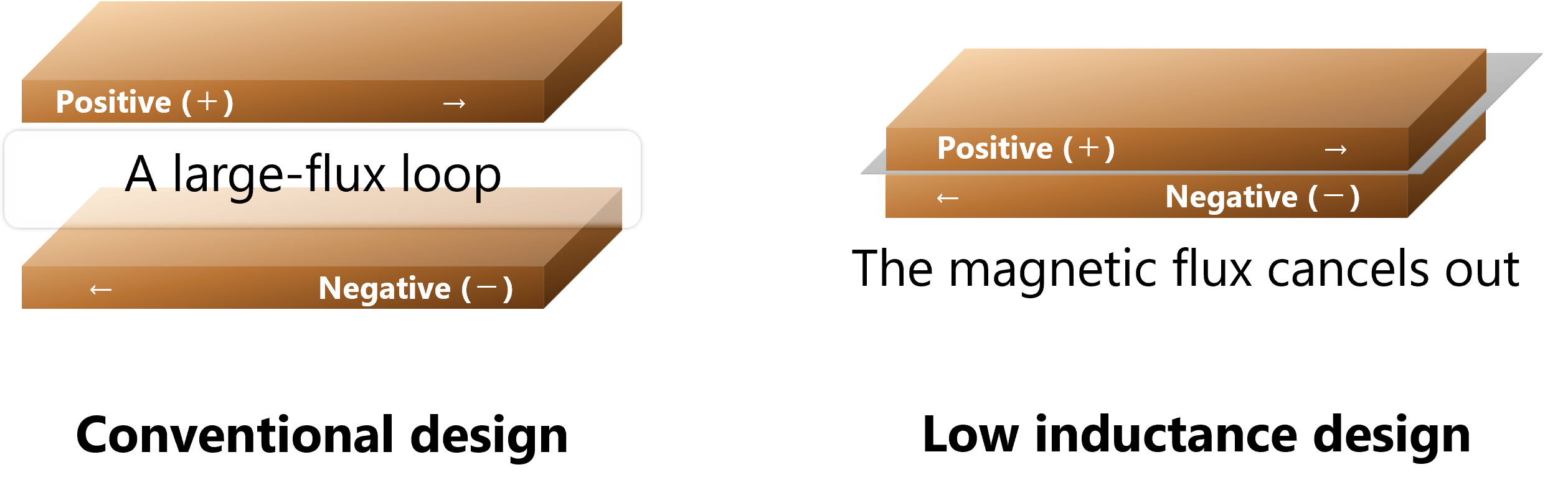 A key feature of laminated busbars is that the forward and return current paths can be placed close to each other. This structure reduces the current loop area and helps minimize parasitic inductance.