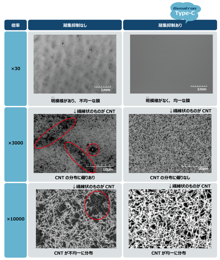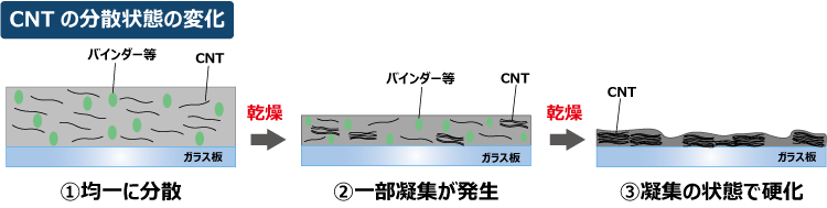 膜中でCNTが凝集すると、膜の外観や物性(導電性など)に悪影響を及ぼします。