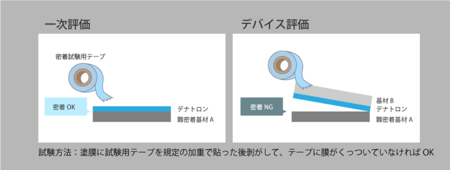 しかし、次のステップであるデバイス評価に進んだところ、デナトロン層が難密着性基材から剥がれてしまうといった結果が返ってきました。