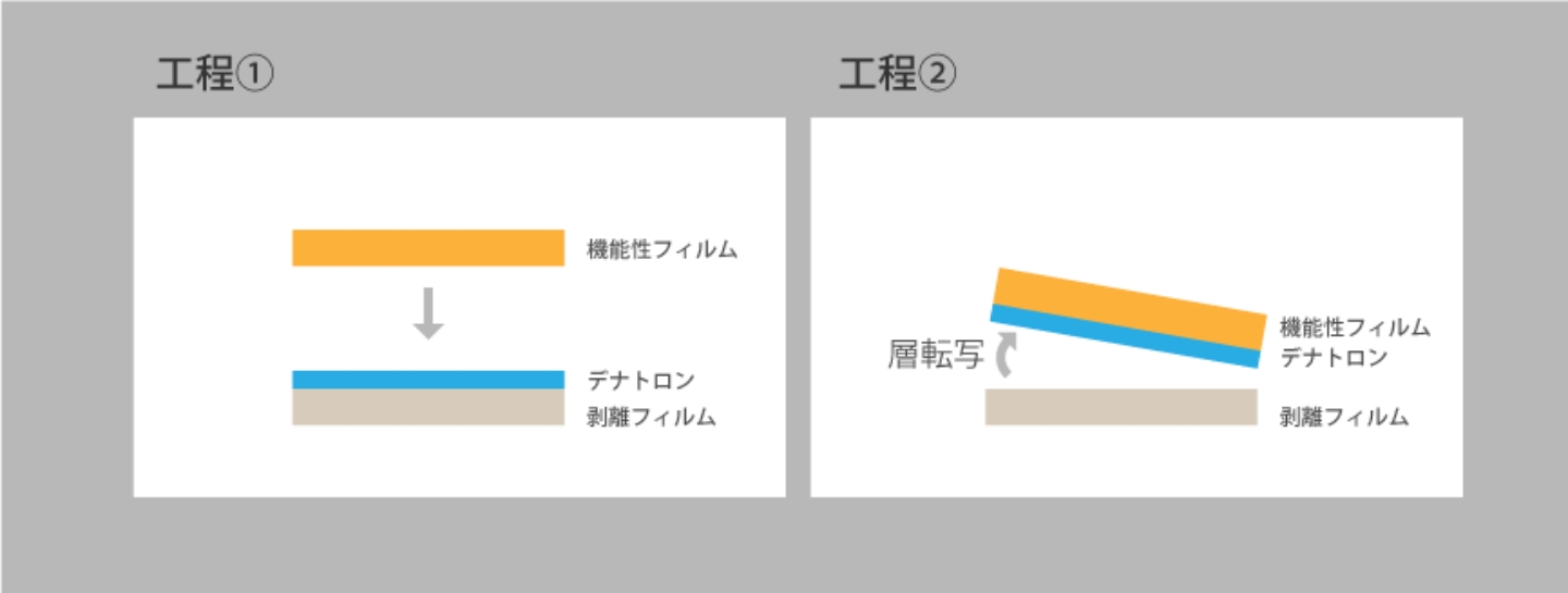 そこで、デナトロン層を一旦剥離フィルム上に製膜した後、機能性フィルムに転写するという工法をとることになりました。