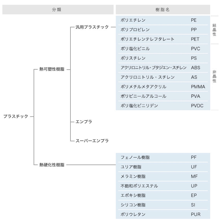 また、プラスチックは、加熱すると硬くなり元には戻らない性質の「熱硬化性樹脂」と、加熱すると軟らかくなり冷やすと固まる性質の「熱可塑性樹脂」に分類され、当社では、成形が容易で生産性に優れた「熱可塑性樹脂」を主に取り扱っています。