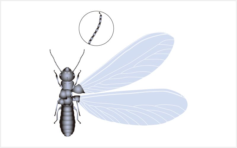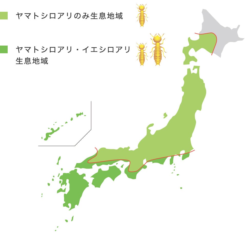 日本には、シロアリ科、ミゾガシラシロアリ科、オオシロアリ科、レイビシロアリ科の4科が生息しています。この中で日本に広く分布し家屋に被害を及ぼす代表的なのは、下の2種類。見かけがよく似ているので区別しにくいですが、イエシロアリの方がやや大型なのが特徴です。