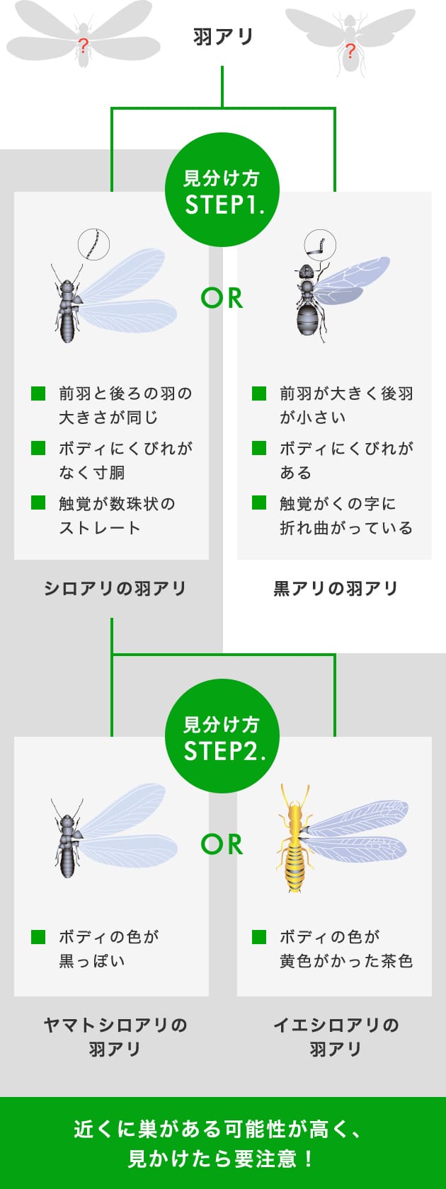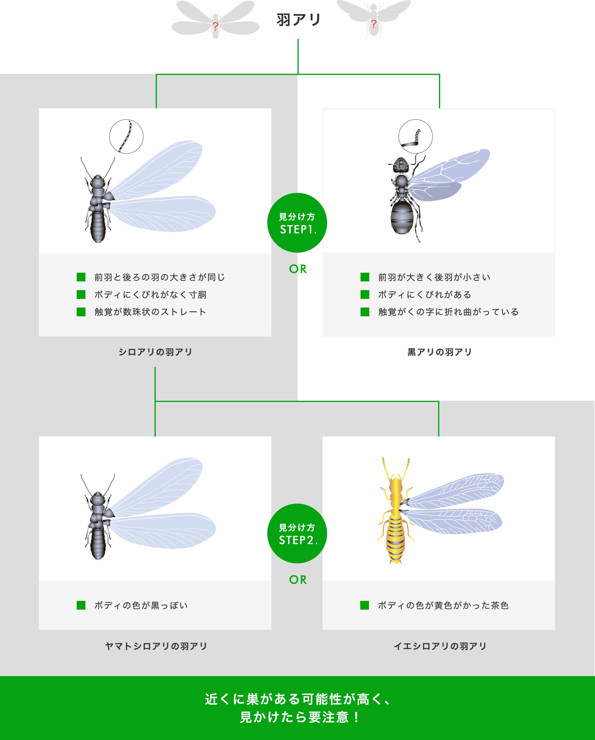 シロアリが新しい巣を作るために現在の巣から旅立つときの姿、それが“シロアリの羽アリ”です。巣から旅立つと、パートナーと出会いつがいとなって新しい巣を作り始めます。“シロアリの羽アリ”や“羽”を見かけたら、近くにシロアリの巣がすでにある、あるいは、これから新しい巣が作られる、という可能性がとても高いと言えます。