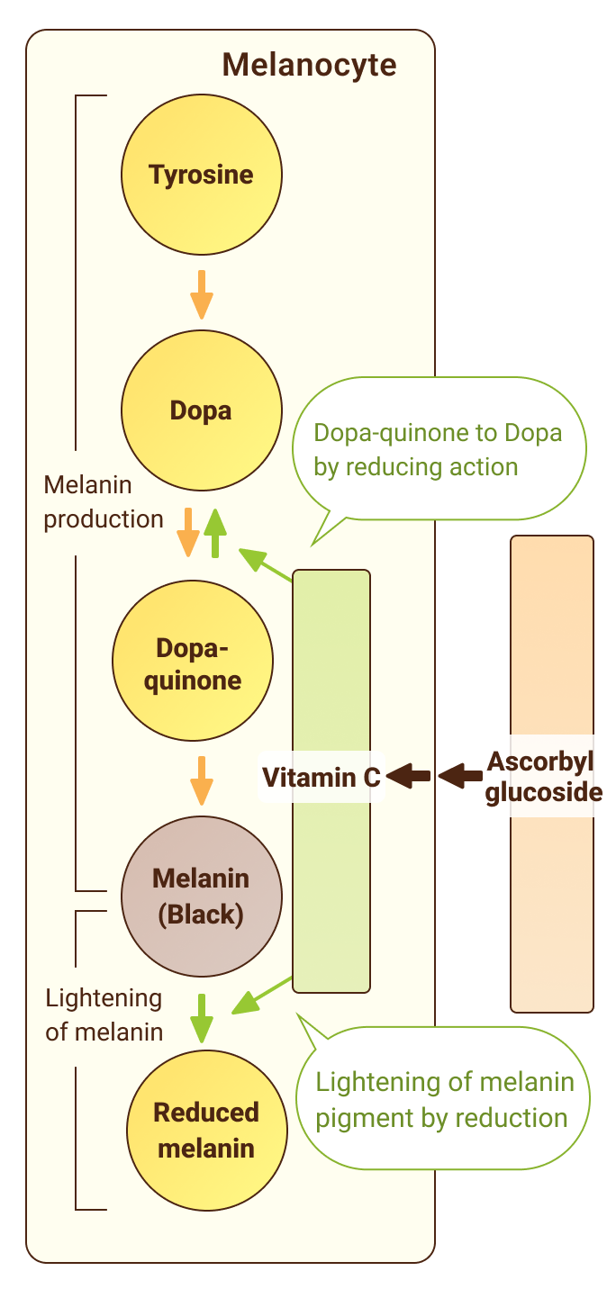 While maintaining high stability within formulations, the skin enzymes cleave ascorbyl glucoside into vitamin C and glucose, enabling cells to uptake vitamin C upon application.