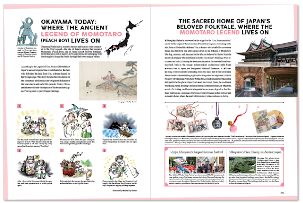 このたび、JALグループの国際線機内誌『SKYWARD』2025年10月号に、岡山の魅力を発信する記事広告を掲載しました。本特集では、桃太郎伝説を皮切りに、その起源といわれる吉備津神社や、岡山の銘菓「きびだんご」を紹介しています。