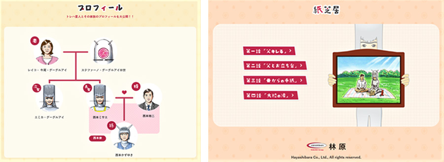 「トレハ星人の部屋」は、林原の宇宙広報マネージャ―として、【林原公式】Twitterを担当しているトレハ星人をより身近に感じてもらうために開設しました。最新トピックの掲示板や活動記録などのほか、約9年ぶりに更新された家族のプロフィールには、これまで詳細が不明だった妻(地球人)のものが追加されました。さらに、家族の変遷がわかる紙芝居や写真集など、トレハ星人のPR活動をより楽しんでいただけるコンテンツとなっています。